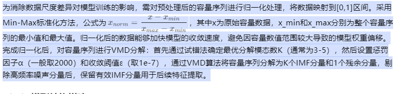 数据预处理是锂电池RUL预测的基础步骤,直接影响模型的训练效果和预测精度。针对锂电池容量数据的特点,预处理主要包括数据清洗、异常值处理和归一化,随后通过VMD实现信号分解与特征初步提取。