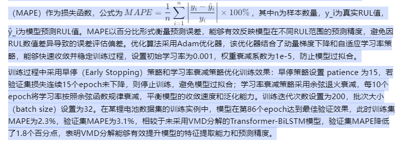 VMD-Transformer-BiLSTM模型的训练过程遵循“数据准备-模型初始化-迭代训练-验证优化”的流程,通过合理的训练策略和优化算法,确保模型能够精准学习锂电池容量衰减规律,提升RUL预测精度。