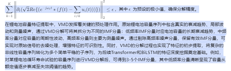 在此背景下,融合分解策略与组合模型的VMD-Transformer-BiLSTM方法应运而生。该方法创新性地将变分模态分解(VMD)与Transformer、BiLSTM相结合,构建“分解-特征提取-融合预测”的完整框架:首先通过VMD将含噪的锂电池容量原始序列分解为多个平稳的模态分量,实现噪声分离与特征初步提取;随后利用Transformer捕捉各模态分量中的长程依赖特征,借助BiLSTM挖掘各分量的局部动态特征;最后通过特征融合与预测输出得到锂电池RUL。这种分解与组合的设计,既解决了原始数据噪声干扰的问题,又充分发挥了不同模型的优势互补作用,显著提升了RUL预测的精度与稳定性。本文将深入剖析VMD-Transformer-BiLSTM模型的核心原理、构建流程及实验效果,为锂电池RUL预测的工程应用提供新思路。