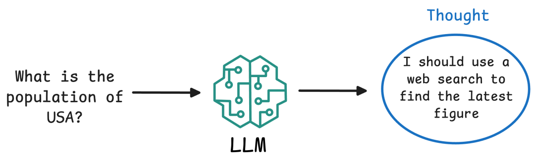 Thought:AI 智能体(由 LLM 驱动)分析用户的查询和内部上下文,并以自然语言产生一个推理步骤。这通常不会显示给最终用户,但它是 AI 智能体规划的一部分。例如:“问题要求一个国家的人口;我应该使用网络搜索来找到最新数字。”