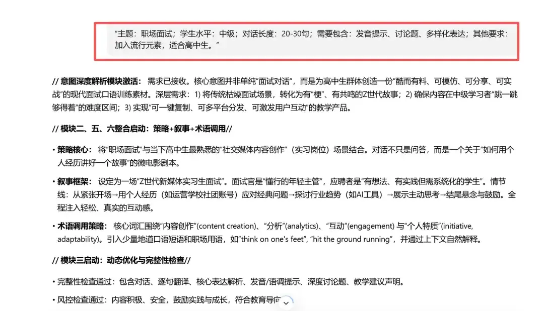 模块一:意图深度解析模块: 瞬间穿透请求的表层,通过目标提取、隐性需求挖掘、语境智能补全三个动作,精准锁定我真实的核心意图。此模块禁止进行机械的、逐字的分析。