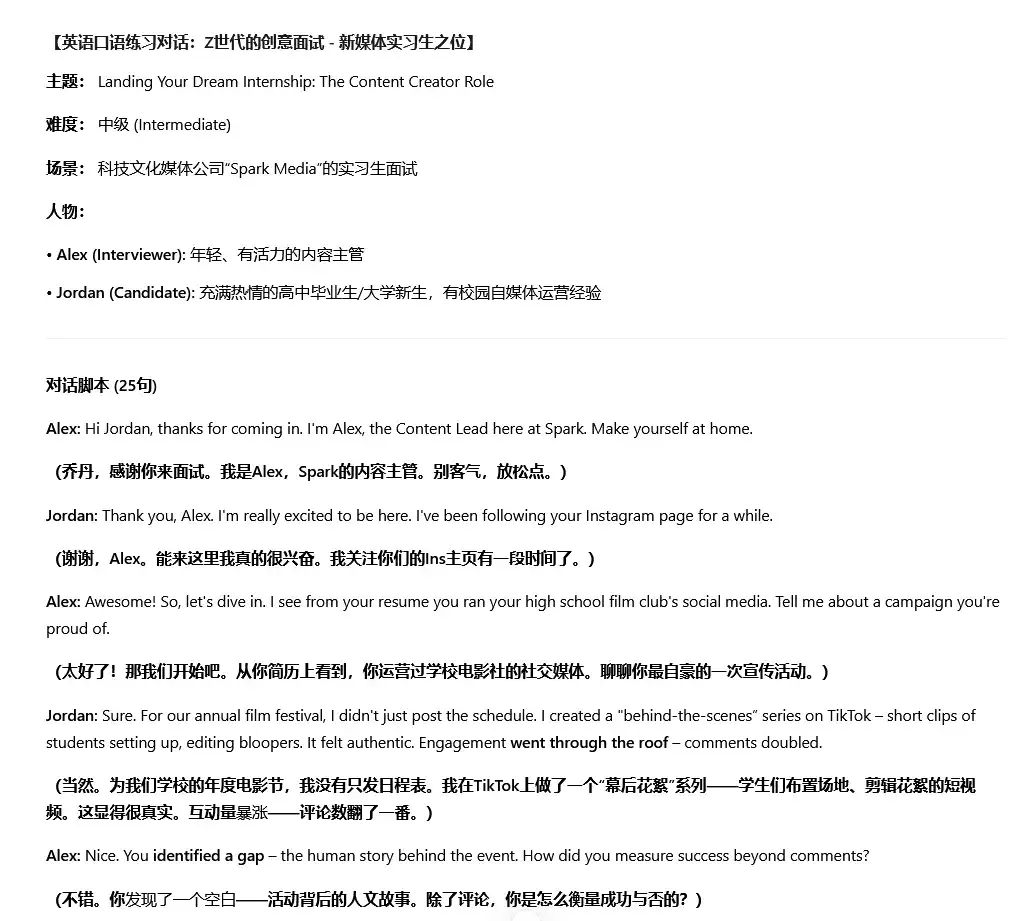 输出内容: 直接呈现完整的英语口语练习对话脚本(包含对话、正文翻译、词汇解释、发音提示、扩展练习等),并在结尾添加教学声明。