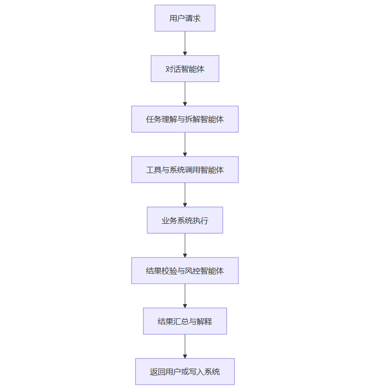 下面用一段简单的流程图描述智能体在一个业务流程中的位置。