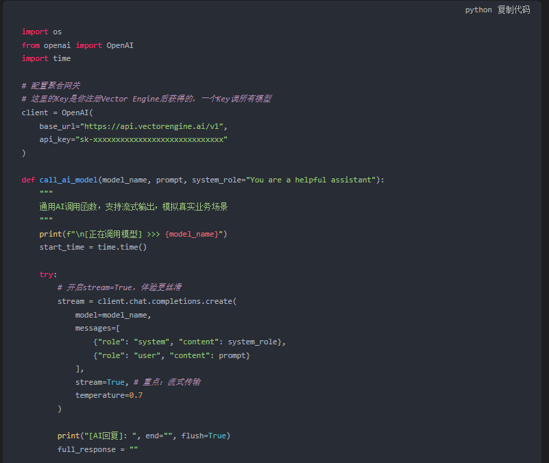 stream=True。对于长文本生成,这能极大地降低用户的心理等待时间(TTFT)。Vector Engine对流式包的转发做了优化,几乎没有延迟。 - 异常处理:在生产环境中,建议加上重试机制(Retry)。