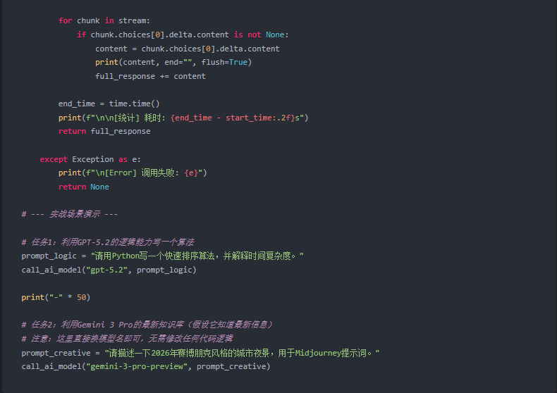 client.chat.completions.create这个方法完全没变。这就是标准化的力量。 - 流式响应 (Streaming):我在代码中开启了