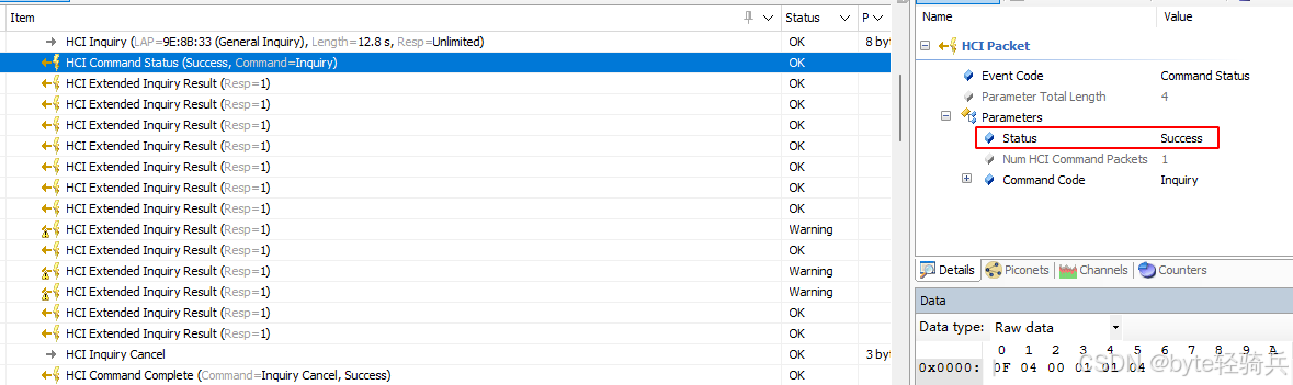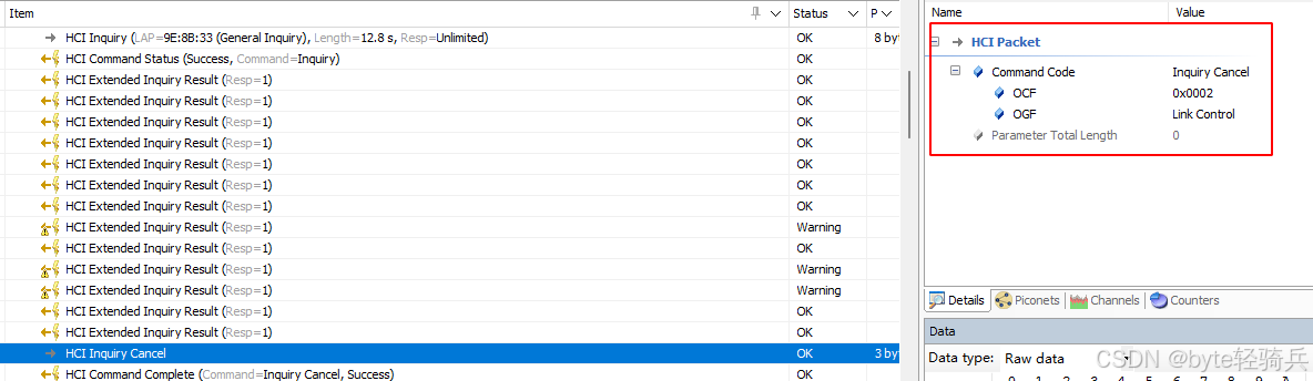 这是Inquiry过程的起点,由主机向蓝牙控制器下发查询命令,核心信息解读如下: