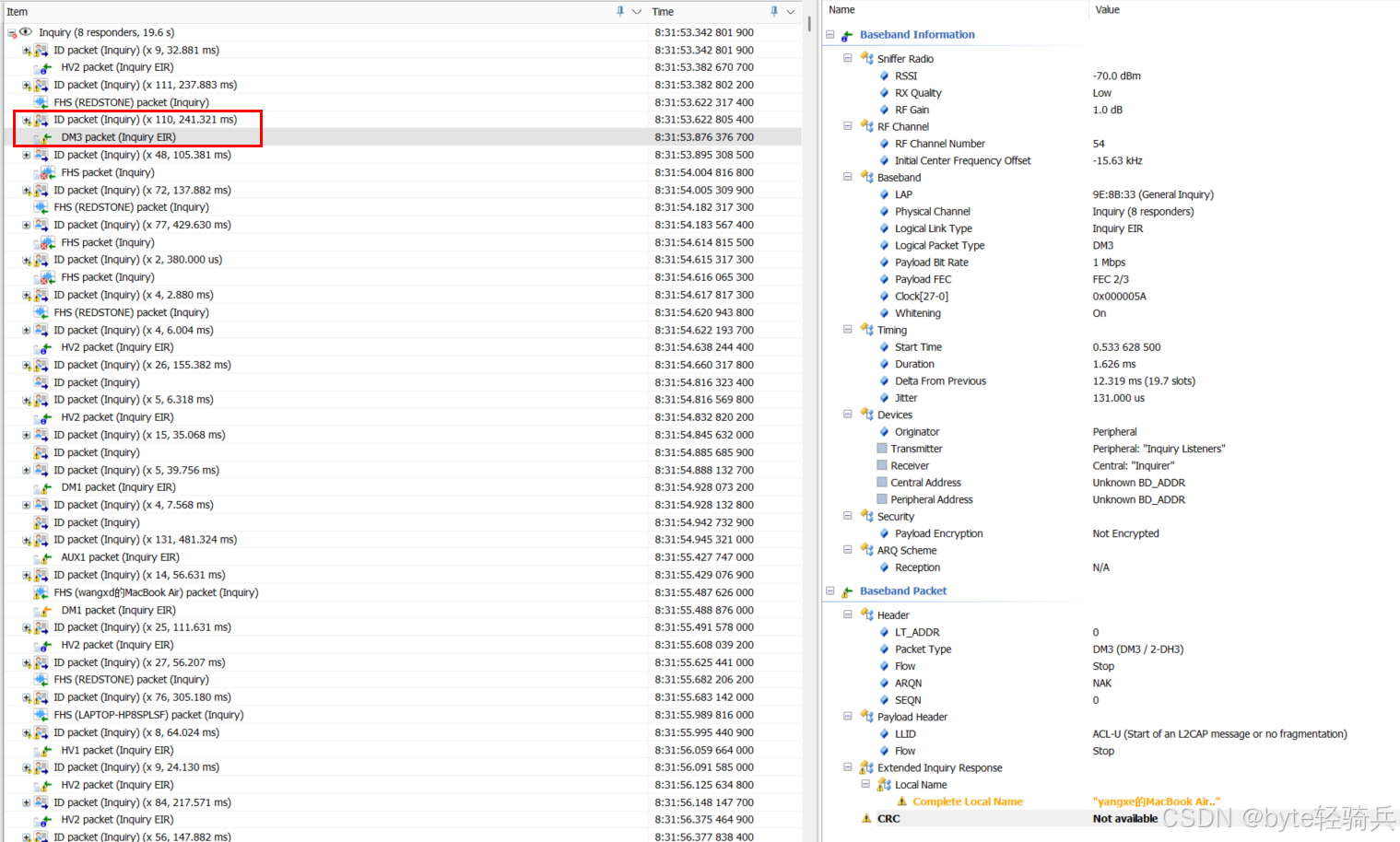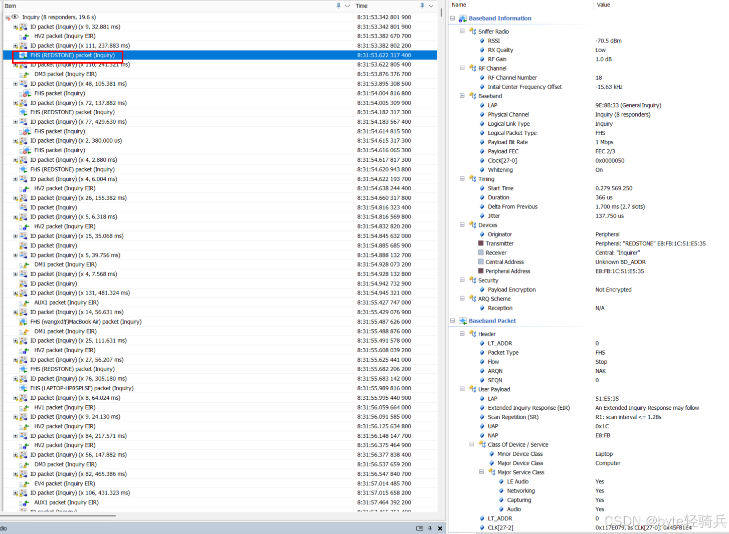 空口视角:空口即蓝牙设备之间的无线传输链路,遵循蓝牙基带协议规范。Inquiry过程中空口会传输特定类型的数据包(如查询请求包、查询响应包),airlog记录的就是这些空口数据包的交互细节。