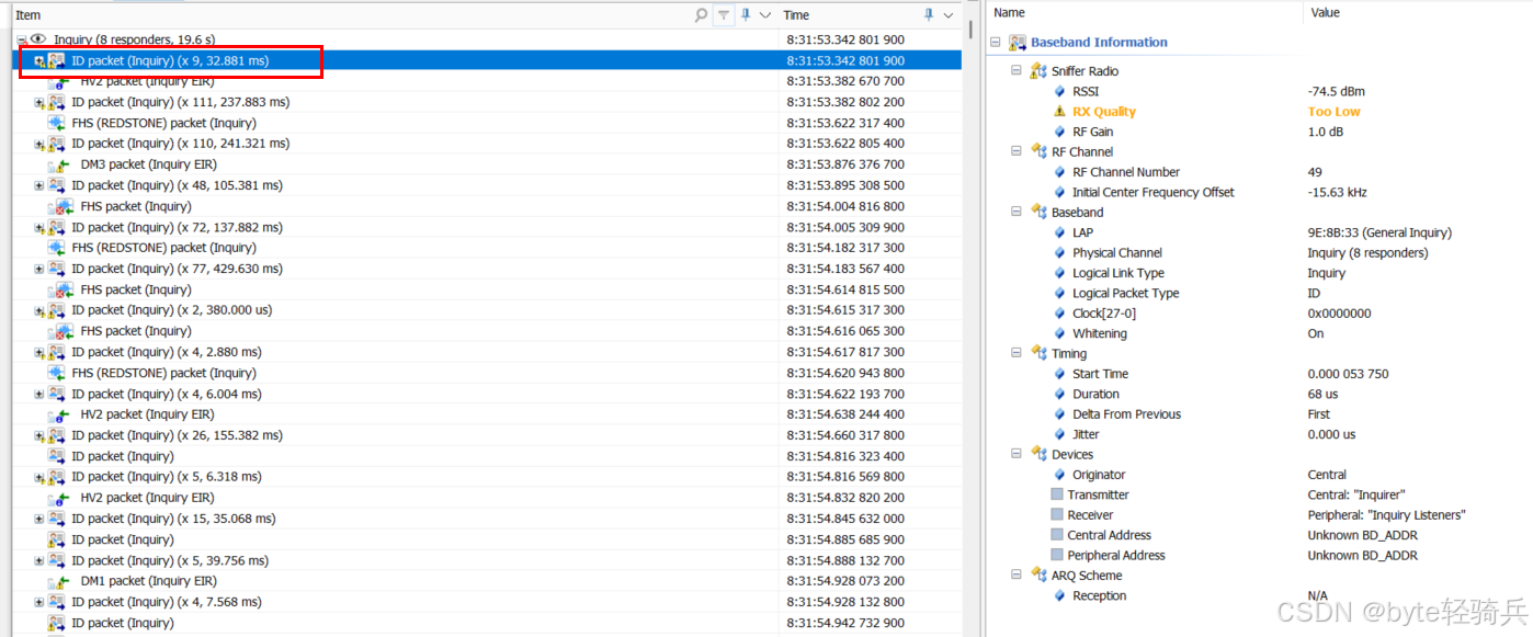 RSSI(-74.5 dBm):处于蓝牙有效通信强度区间(通常-40~-80 dBm),但接近下限;结合“RX Quality: Too Low”,说明当前空口存在干扰或设备距离较远。