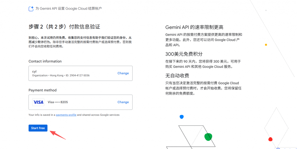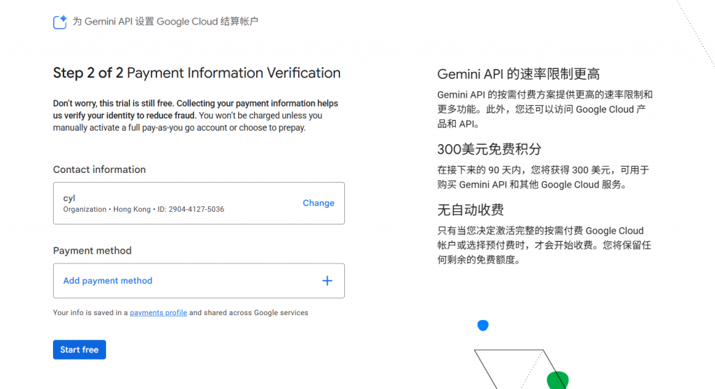 - 付款信息:如实填写信用卡信息。 安全贴士:Google 会在试用期结束或额度耗尽后自动停止你的资源,除非你手动点击 “激活完全付费账号”,所以不用担心被反撸。