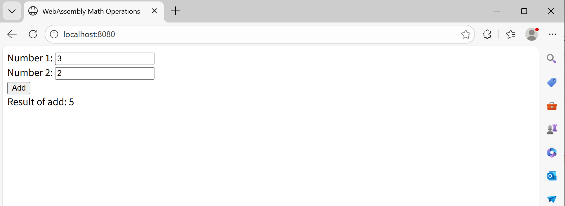 <!DOCTYPE html> <html lang="en"> <head> <meta charset="UTF - 8"> <meta name="viewport" content="width=device - width, initial - scale = 1.0"> <title>WebAssembly Math Operations</title> </head> <body> <label for="num1">Number 1:</label> <input type="number" id="num1"> <br> <label for="num2">Number 2:</label> <input type="number" id="num2"> <br> <button onclick="calculate('add')">Add</button> <div id="result"></div> <script> let wasmModule; async function loadWasm() { const response = await fetch('add.wasm'); const buffer = await response.arrayBuffer(); const module = await WebAssembly.instantiate(buffer); wasmModule = module.instance.exports; } function calculate(operation) { if (!wasmModule) { alert('WebAssembly module not loaded yet.'); return; } const num1 = parseInt(document.getElementById('num1').value); const num2 = parseInt(document.getElementById('num2').value); let result; if (operation === 'add') { result = wasmModule.add(num1, num2); } document.getElementById('result').innerText = `Result of ${operation}: ${result}`; } loadWasm(); </script> </body> </html> - 整个文件夹与文件如图