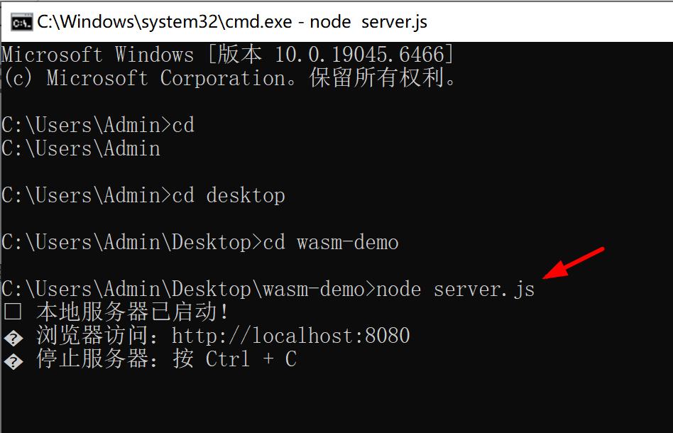 // server.js:Node.js 原生静态服务器 const http = require('http'); const fs = require('fs'); const path = require('path'); const port = 8080; // 服务器端口(可改,如 3000) // 定义文件类型映射(关键:WASM 文件需指定正确的 Content-Type) const mimeTypes = { '.html': 'text/html; charset=utf-8', '.wasm': 'application/wasm', // WASM 必须的 MIME 类型 '.js': 'application/javascript', '.css': 'text/css' }; // 创建服务器 const server = http.createServer((req, res) => { // 解析请求的文件路径(默认加载 index.html) const filePath = path.join(__dirname, req.url === '/' ? 'index.html' : req.url); // 获取文件扩展名,匹配 MIME 类型 const extname = path.extname(filePath); const contentType = mimeTypes[extname] || 'application/octet-stream'; // 读取并返回文件 fs.readFile(filePath, (err, content) => { if (err) { // 404 处理 res.writeHead(404, { 'Content-Type': 'text/plain' }); res.end(`文件未找到:${req.url}`); return; } // 成功返回文件(设置正确的 MIME 类型) res.writeHead(200, { 'Content-Type': contentType }); res.end(content); }); }); // 启动服务器 server.listen(port, () => { console.log(`✅ 本地服务器已启动!`); console.log(`👉 浏览器访问:http://localhost:${port}`); console.log(`🔴 停止服务器:按 Ctrl + C`); }); - 创建一个index.html文件