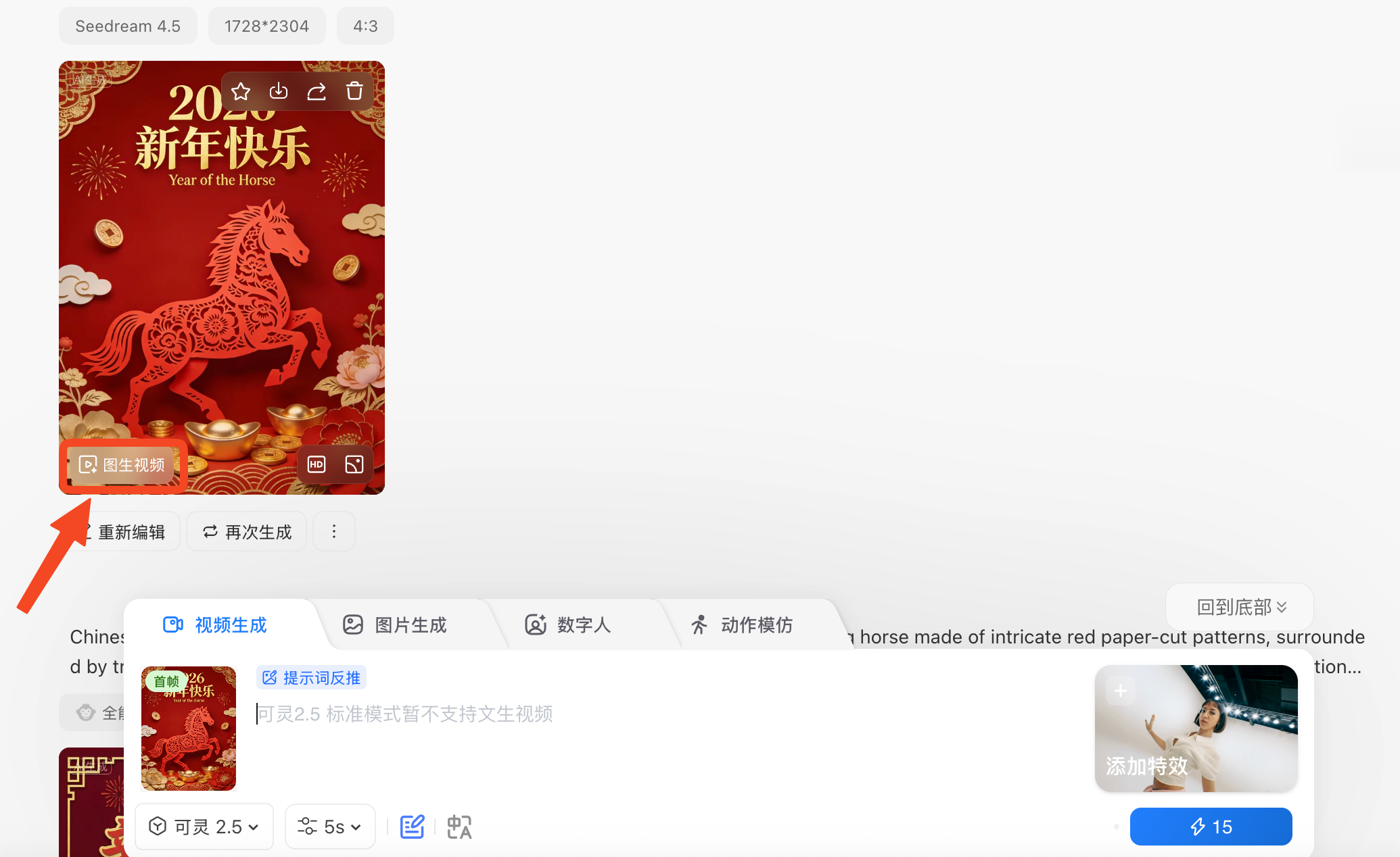 生成好的图片,点「图生视频」,直接跳转到视频界面。