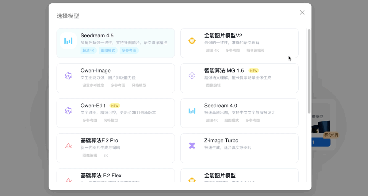 全能图片模型 V2(香蕉 Pro)、Seedream 4.5、Qwen-Image、Z-Image、Midjourney V7、Flux.2。