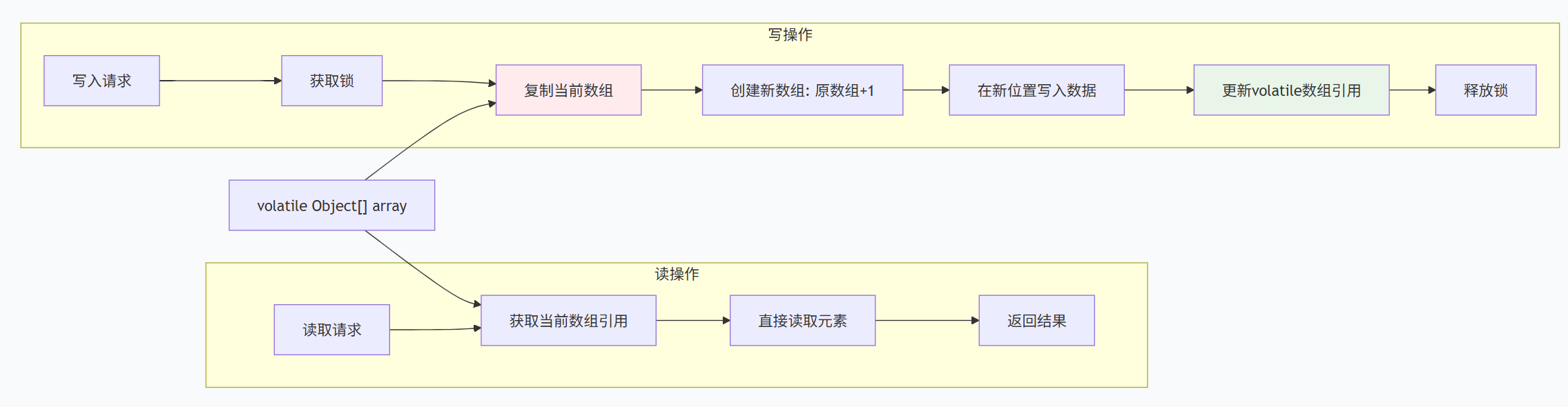 volatile修饰的数组存储元素 。 - 读操作:直接访问当前数组,无需锁控制。