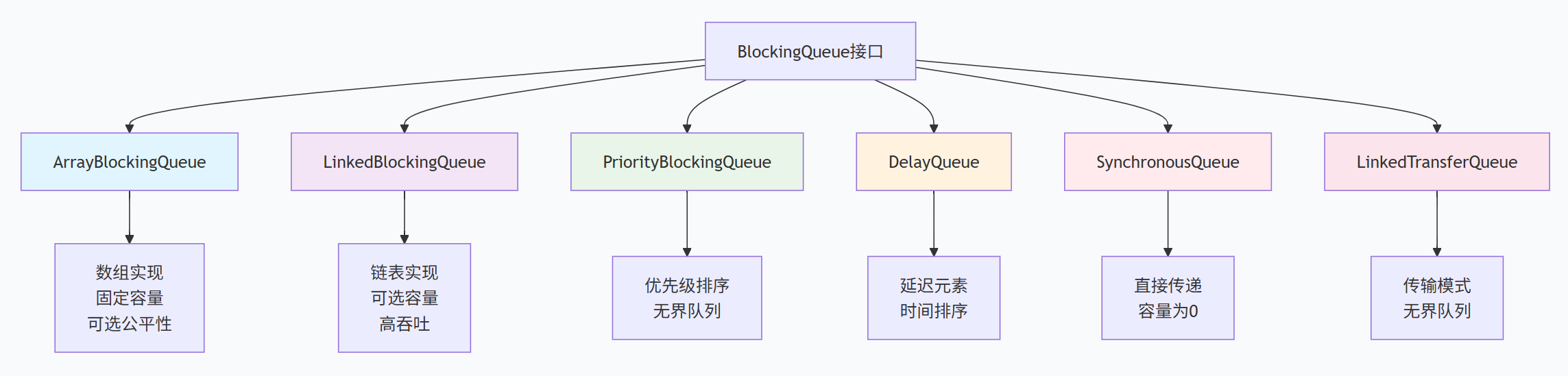 | LinkedBlockingQueue | 链表,可选容量,双锁分离 | 高吞吐生产者-消费者 | 可选有界 |