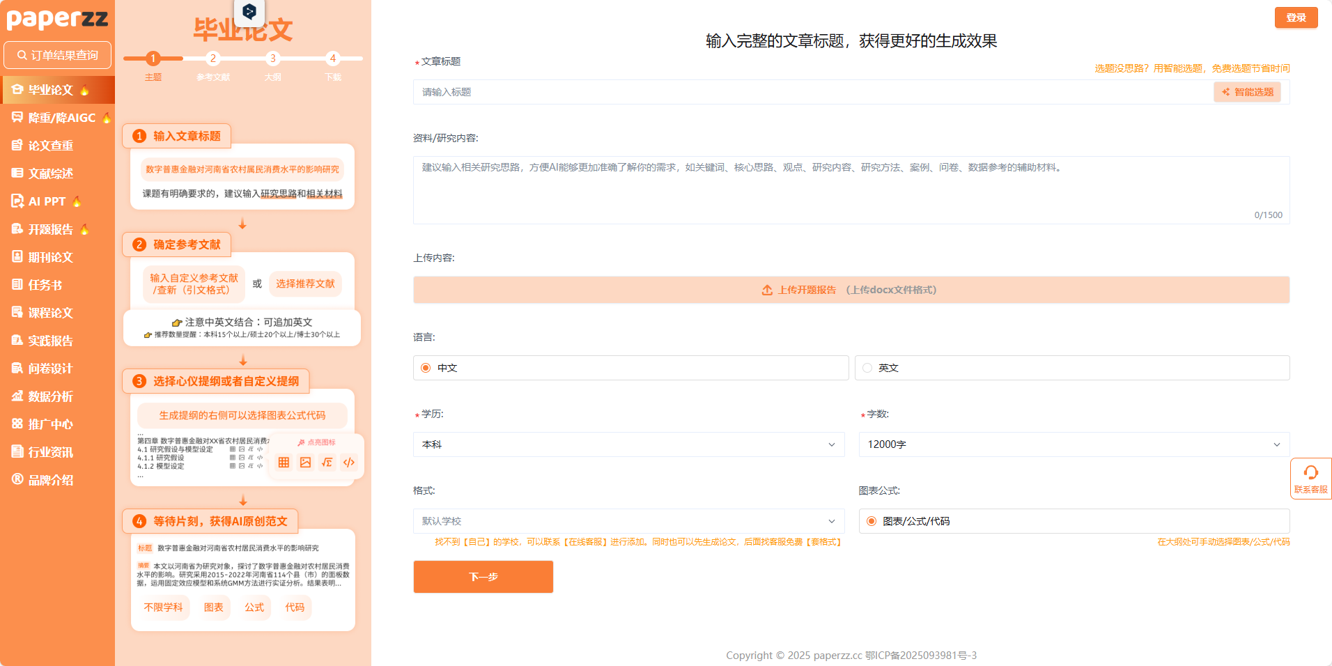 前面的步骤都完成后,只需要点 “下一步”,paperzz 就会帮你生成 “带内容、带格式、带参考文献” 的初稿: