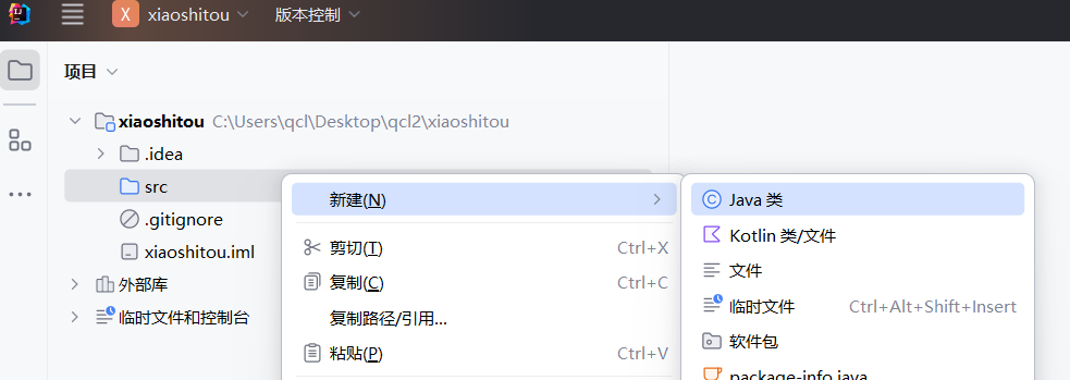 我们在src下面先简单的写一个可以运行的Java单文件,右键src,点击新建,点击java类