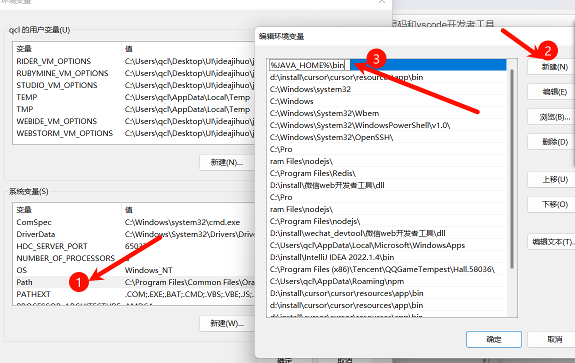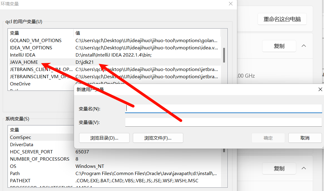 window电脑配置Java全局环境变量命令行,我的路径是D:\jdk21