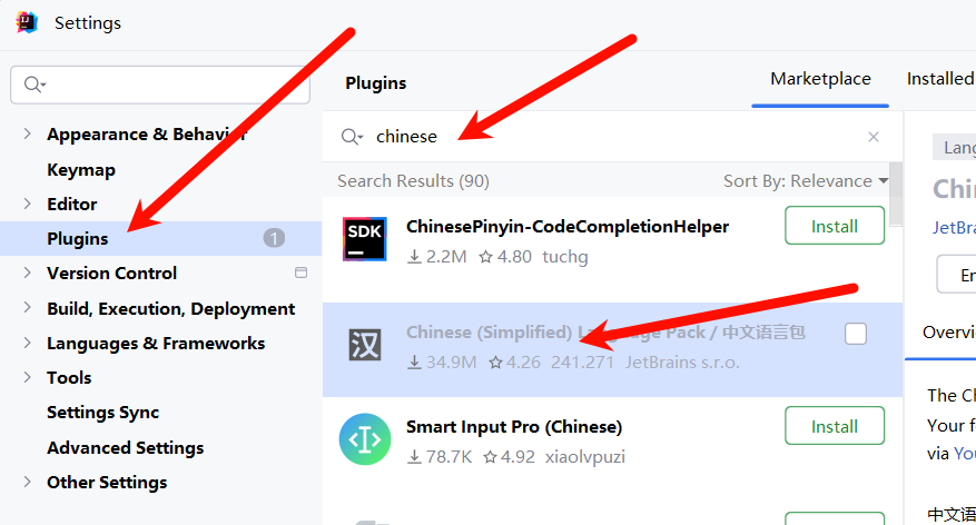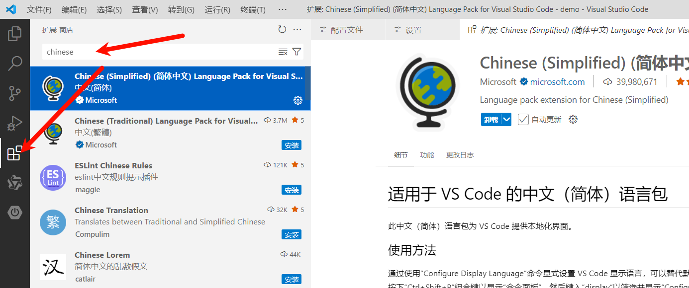 进入插件市场搜索chinese