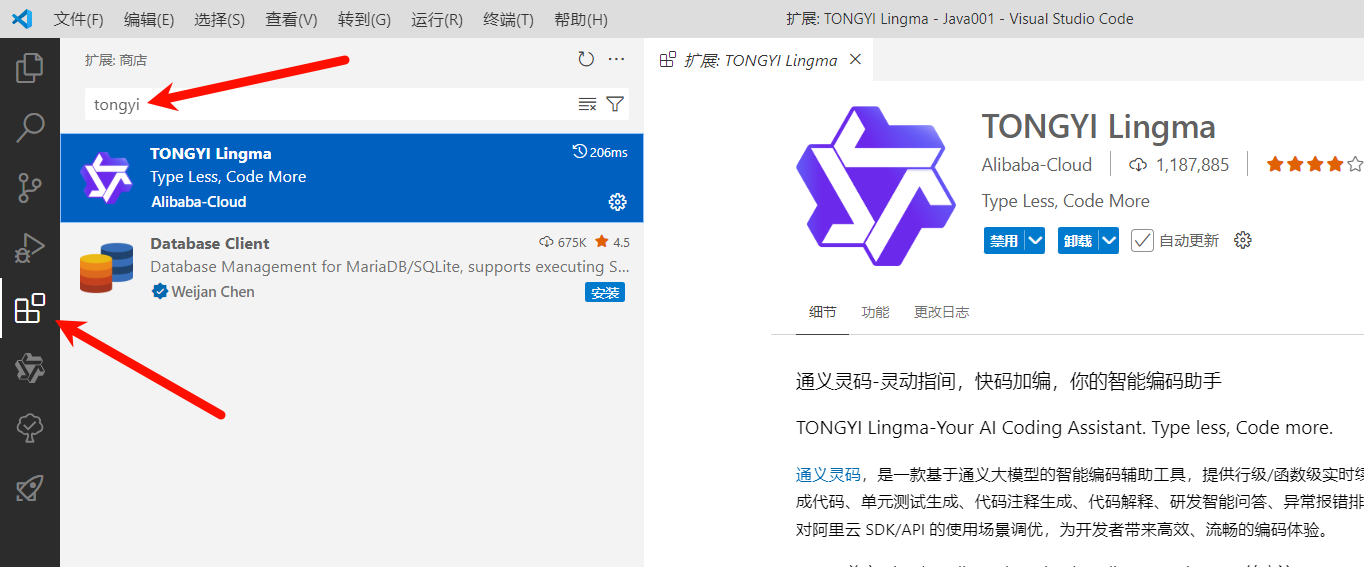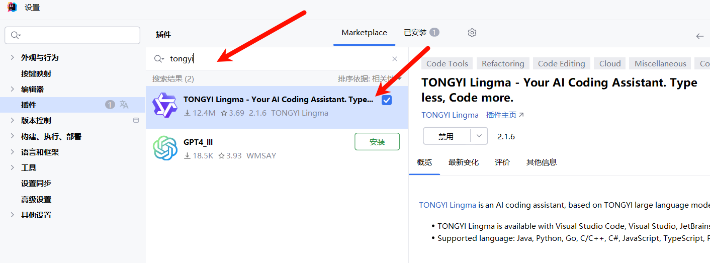 idea里安装ai插件也是直接搜索tongyi,点击安装即可