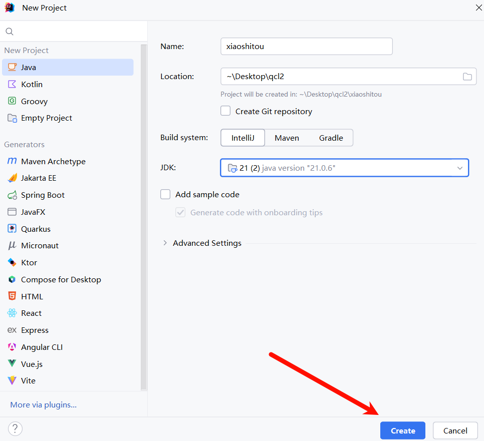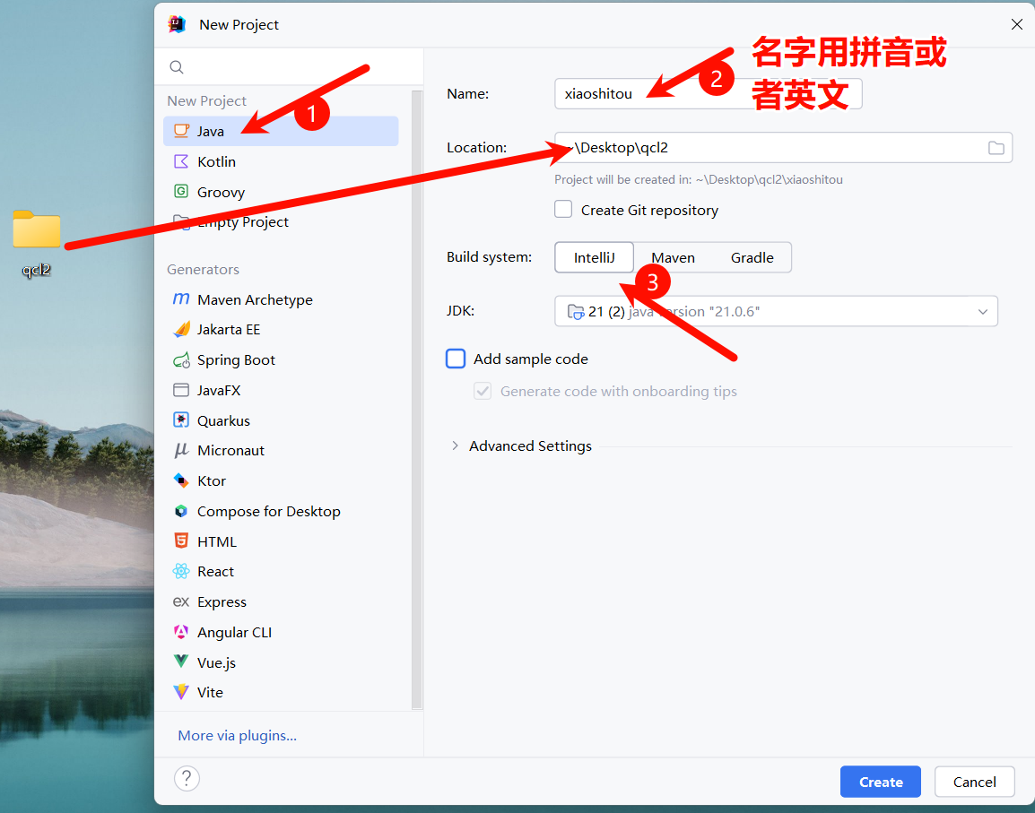 然后选中java,项目名称随便取,用英文或者拼音都可以,路径就选择自己在桌面新建的文件夹。其他都保持默认,jdk部分需要重点说下。