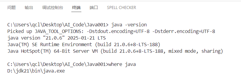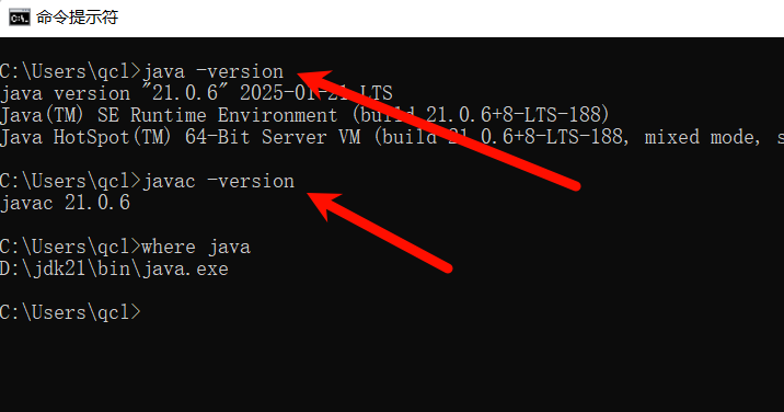 然后可以输入 java -version查看是否配置好了,也可以通过where java查看jdk安装路径