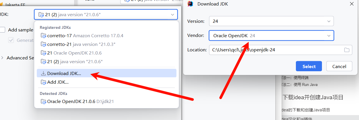 jdk先使用idea自带的,可以直接下载idea自带的jdk,选择最新版即可