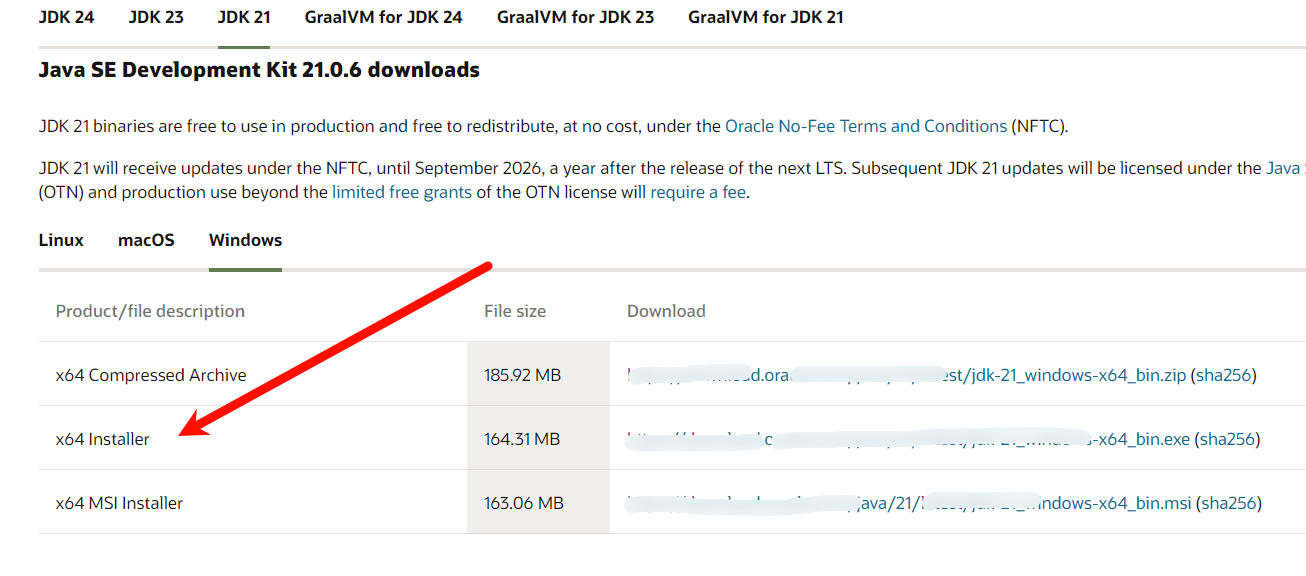 但是我们开发Java项目要使用LTS长期版。所以我们使用jdk21,下载exe版就行