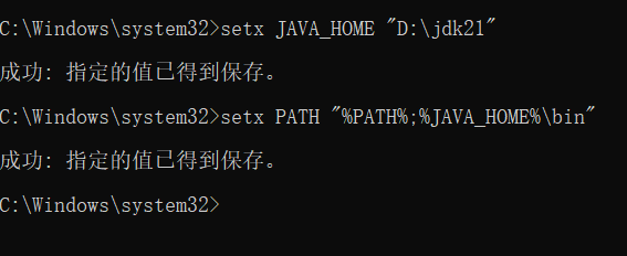 setx JAVA_HOME "D:\jdk21"