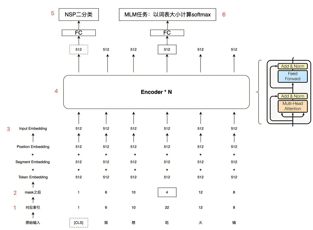 MASK]标记替换,10%的概率用随机的一个单词替换(这有助于模型学习理解上下文的重要性,而不仅仅是依赖于[MASK]标记),剩下的10%则保持不变(这有助于模型在微调阶段更好地处理未遮蔽的单词)。 - 模型预测:模型的目标是根据上下文预测这些被遮蔽单词的原始值。这种机制促使BERT能够深入理解文本中的语义关系。