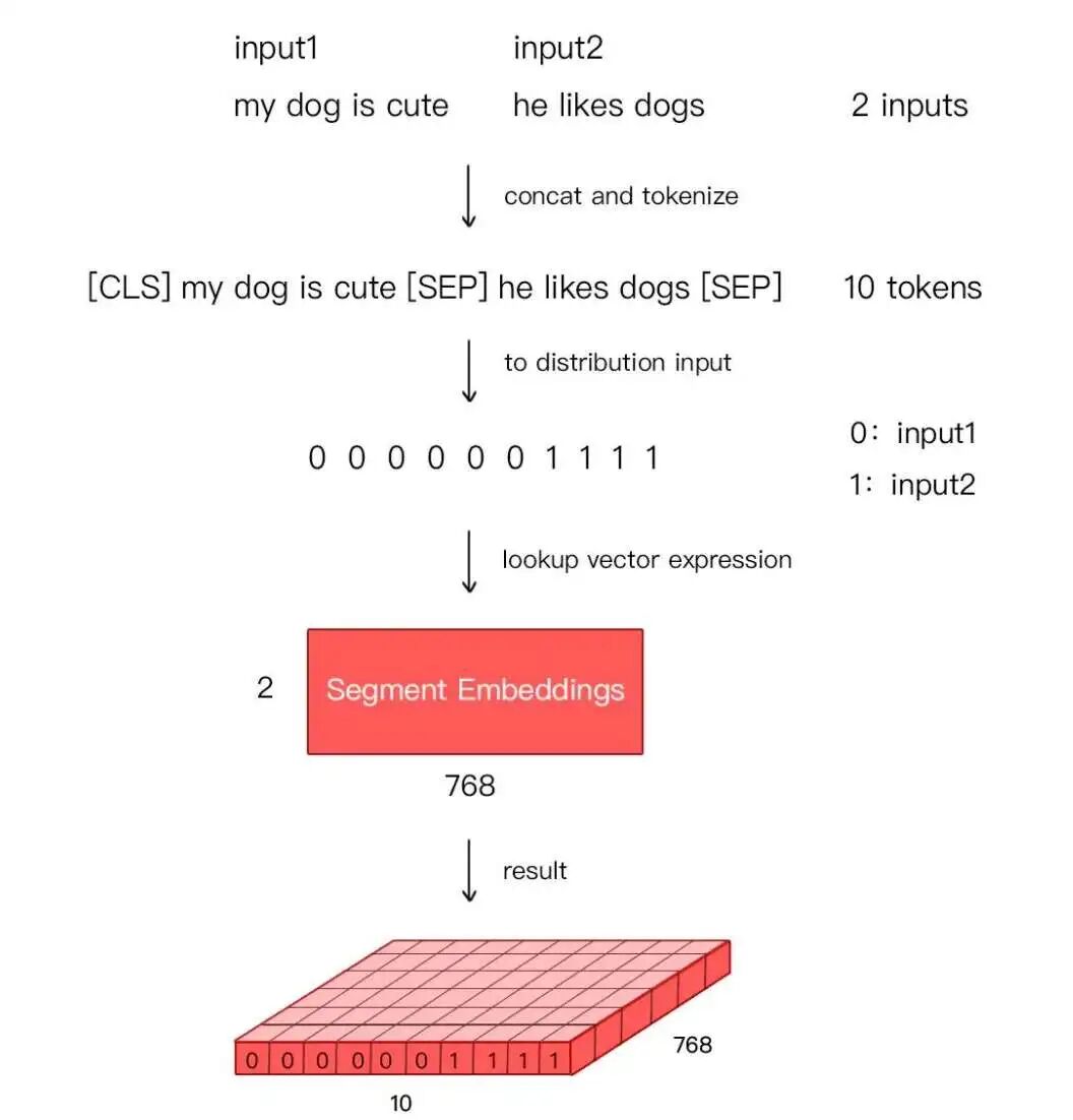 Token Embeddings:输入文本中的每个单词或字符转换为一个固定维度的向量。Base版为768维,Large版为1024维。Position Embeddings:单词或字符在句子中的位置信息。BERT中的位置嵌入是可学习的,它会随着模型的训练而更新,非固定的三角函数。Segment Embeddings:用于区分同一输入序列中不同句子的来源。对于多句输入,BERT会为每个句子分配一个不同的段编号,来区分它们。Segment Embeddings的取值通常是0和1,如果输入包含两个句子,通常第一个句子的token会被赋予全0的向量,第二个句子的token会被赋予全1的向量。下图是一个示例。