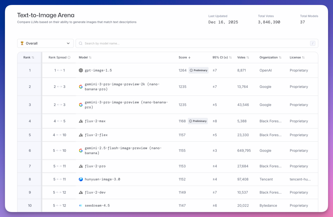 Text-to-Image Arena(文生图)榜单上,OpenAI gpt-image-1.5 以 1264 分排第一。