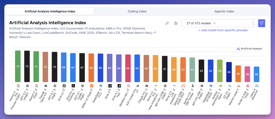 最新的 Intelligence Index v3.0 综合了 10 项评估,覆盖知识、推理、数学、编程、指令遵循、长文本理解、智能体任务等维度。