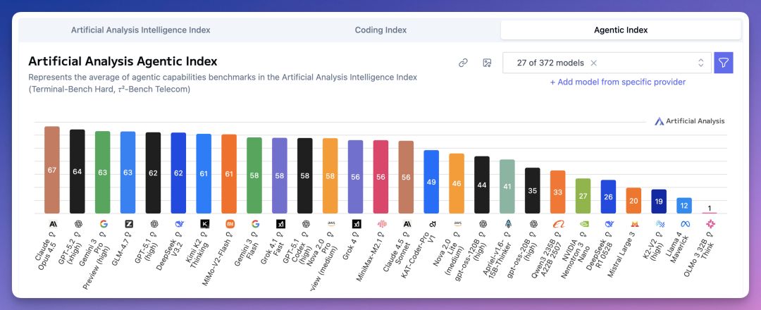Agentic Index(智能体能力)是 2025 年的新赛道,测试模型执行复杂多步骤任务的能力。
