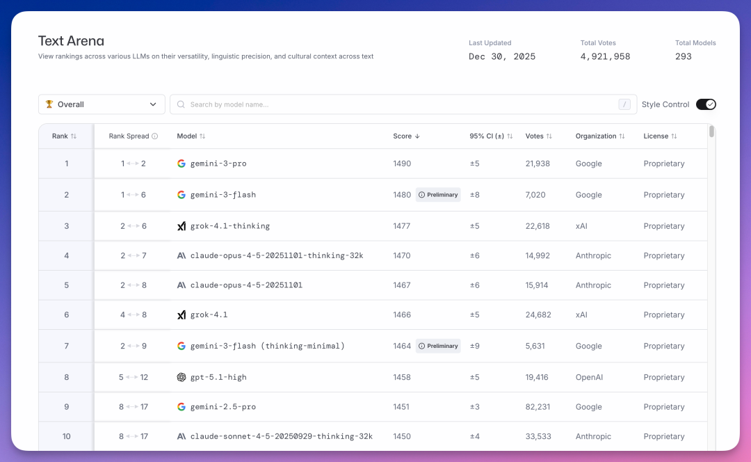 Text Arena 是 LMArena 最核心的榜单,截至 12 月 30 日累计投票数近 500 万。
