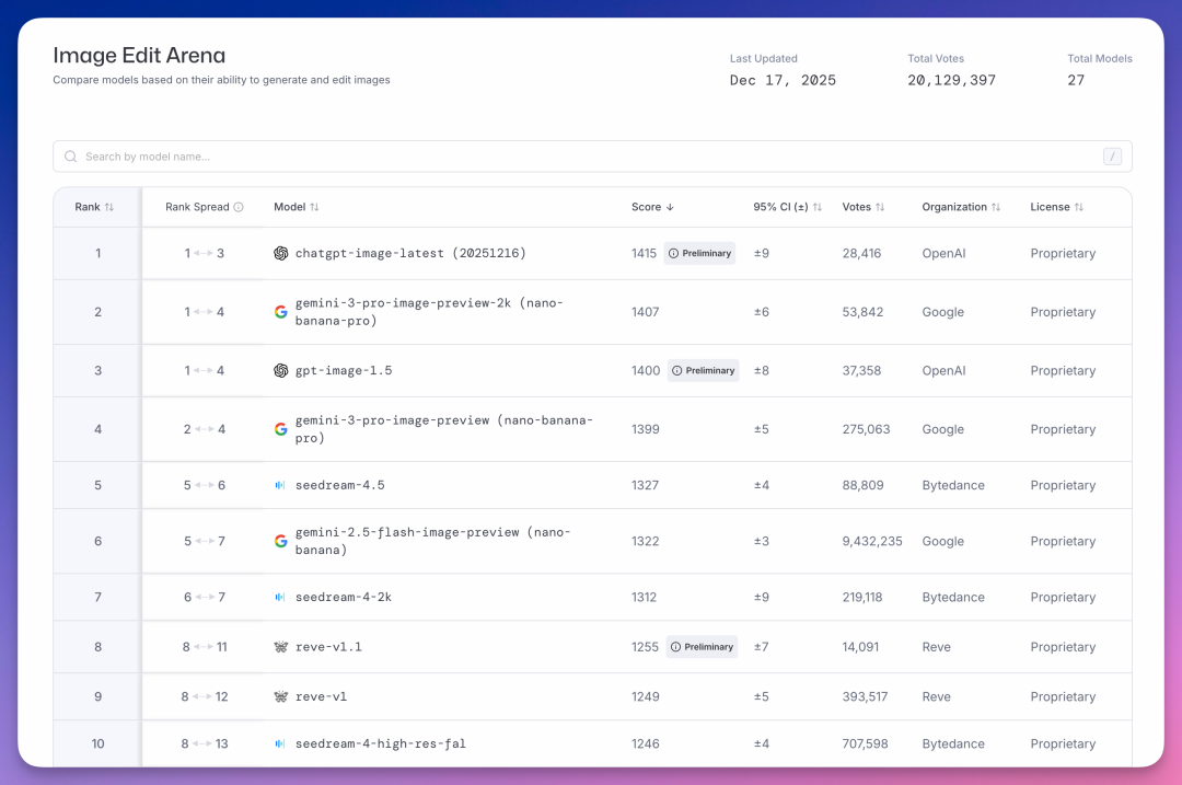 Vision Arena 测试模型理解和处理图像(多模态)的能力,截至 12 月 16 日累计 57 万票。