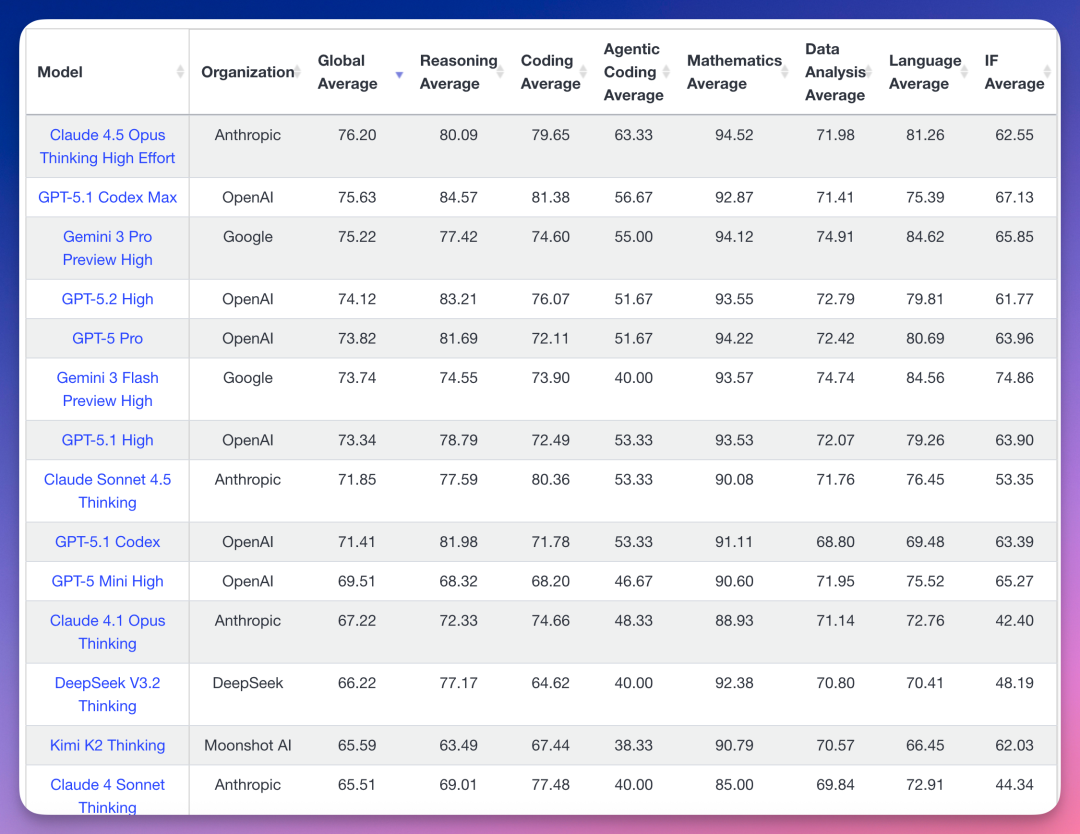 Anthropic Claude 4.5 Opus Thinking High Effort 以 76.20 分排第一。