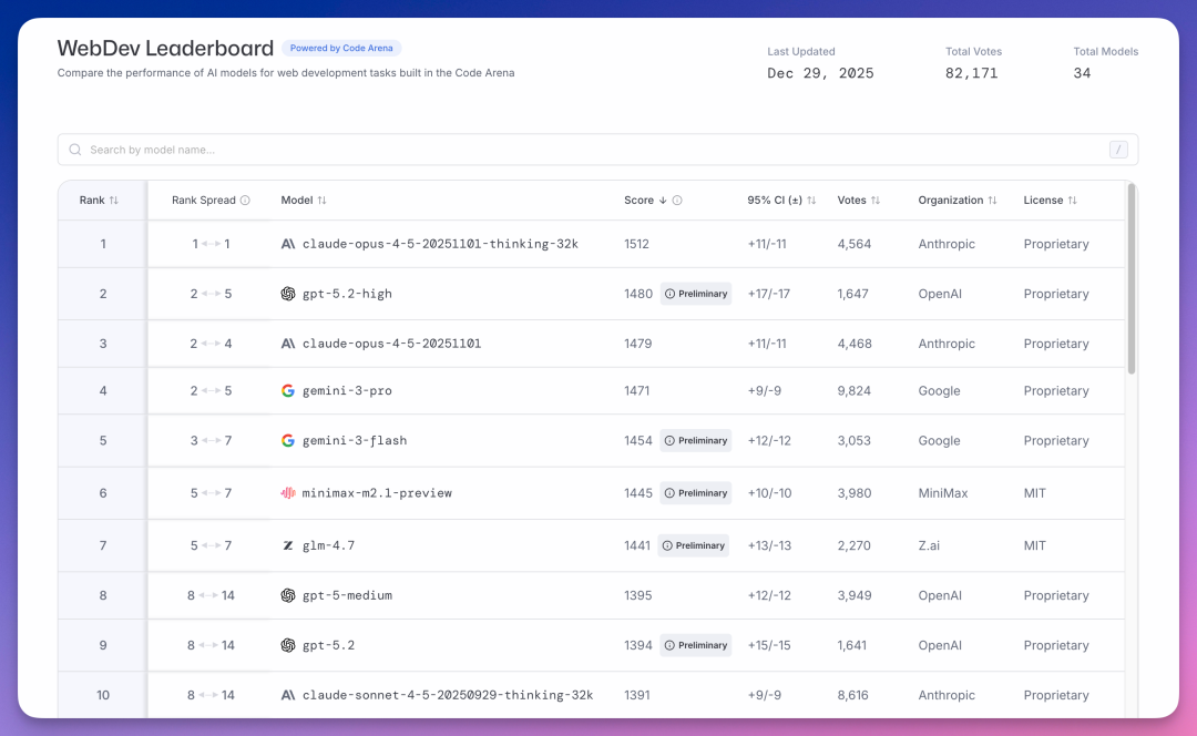 WebDev Leaderboard 测试模型写前端代码的能力,截至 12 月 29 日累计 8 万票。