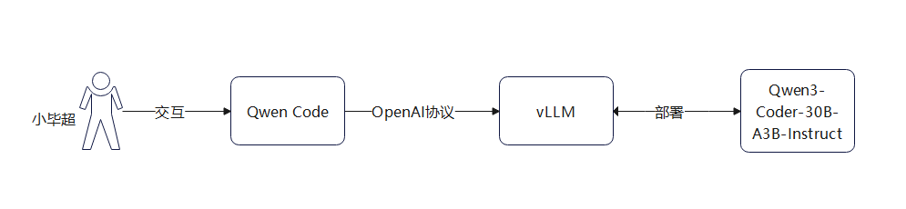 Qwen Code 是一款类似于 Claude Code的AI编程助手,由阿里通义千问团队推出,一定程度上可以作为 Claude Code的平替工具,本文通过 Qwen Code + vLLM + Qwen3-Coder-30B-A3B-Instruct 构建纯内网下私服级开发辅助引擎,主要流程如下所示: