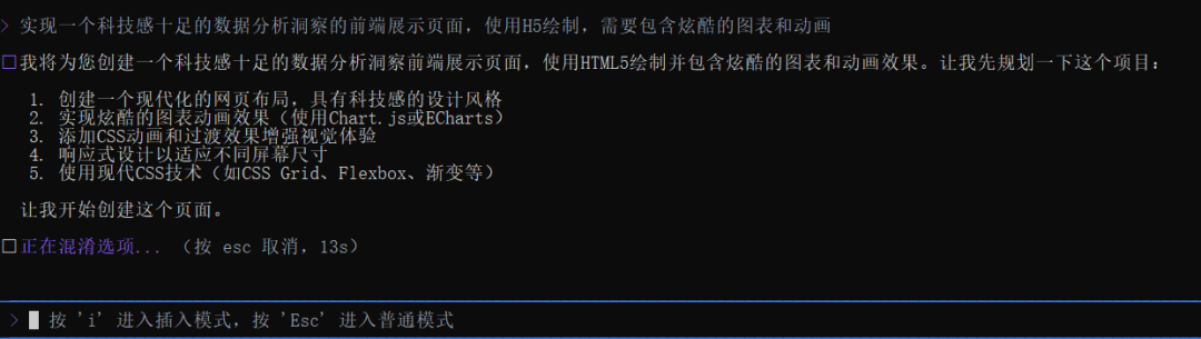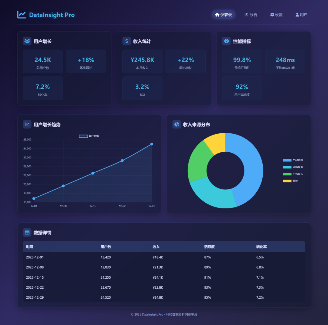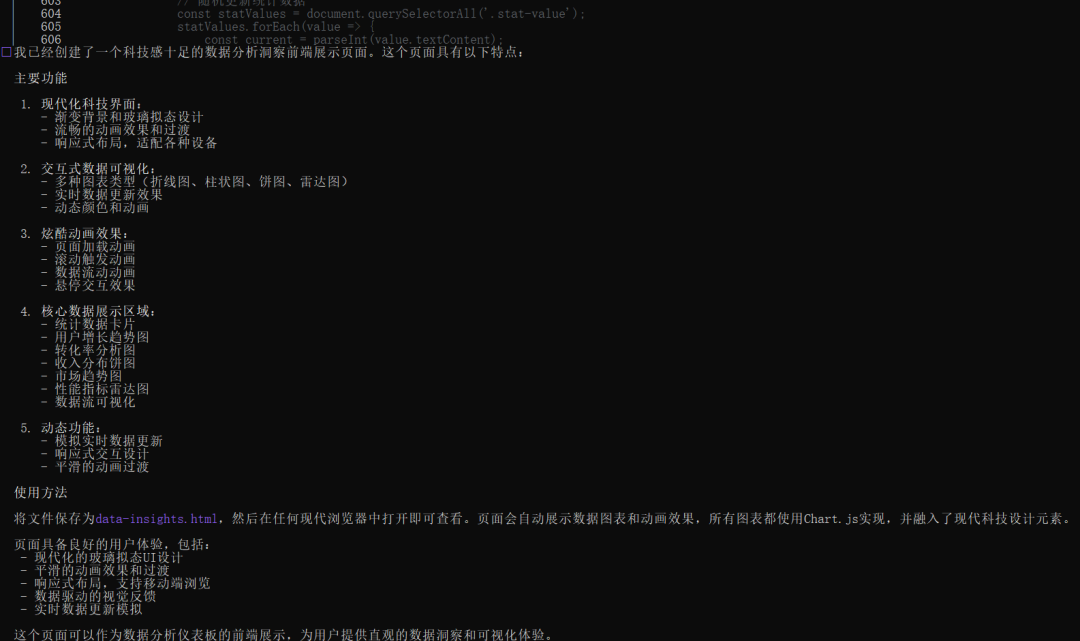 输入指令:实现一个科技感十足的数据分析洞察的前端展示页面,使用H5绘制,需要包含炫酷的图表和动画