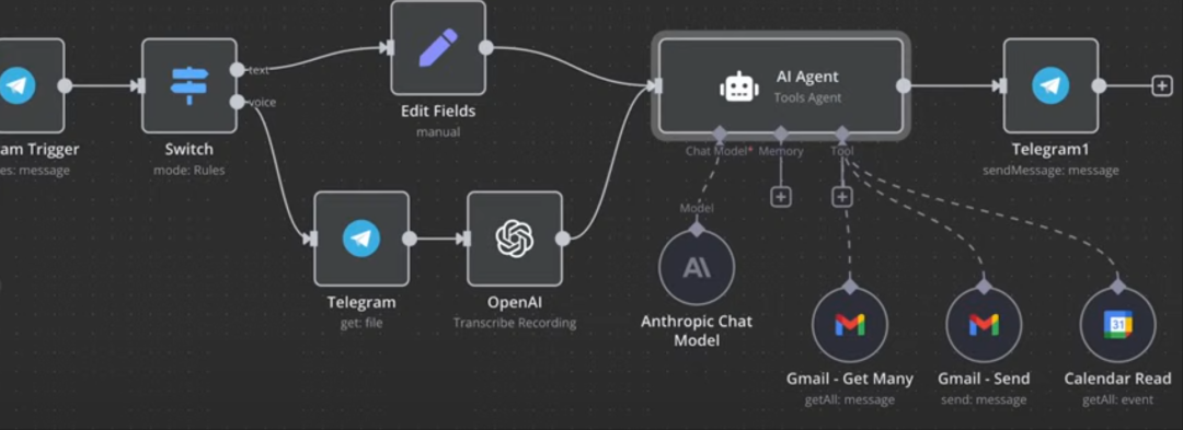 与仅停留在“语言”层面的LLM不同,AI Workflow 的核心突破在于能够接入并操作各种外部工具,从而将AI的能力从对话拓展到实际执行。例如,目前流行的AI自动化工具如n8n和扣子,它们可以连接你的聊天应用、邮件账号等,真正实现从“语言”走向“行动”。