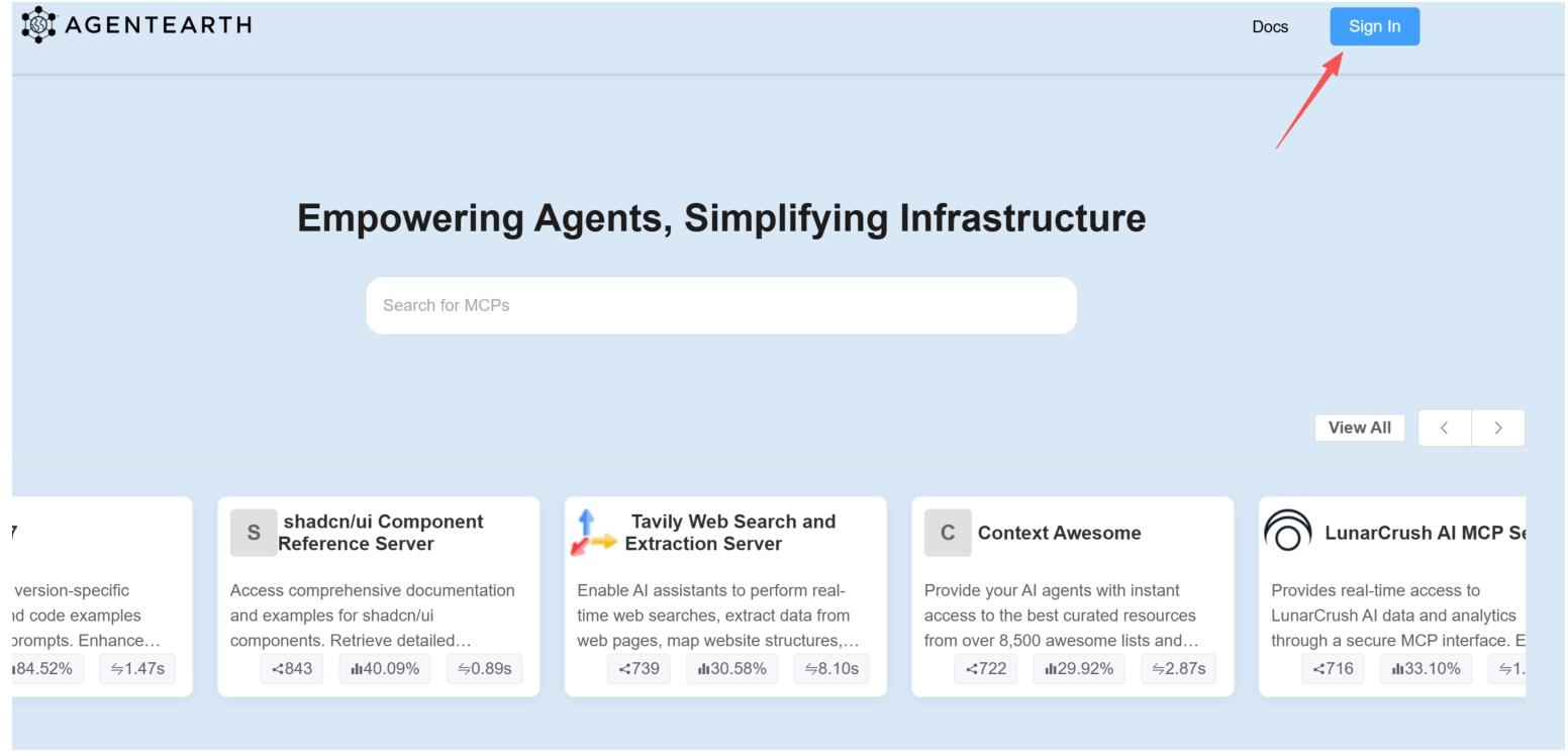 返回 AgentEarth 平台,进入「MCP Servers」相关页面(可通过「View All」查看全部 MCP 服务,如 VSGuard、Exa Search、shadcn/ui Component 等);