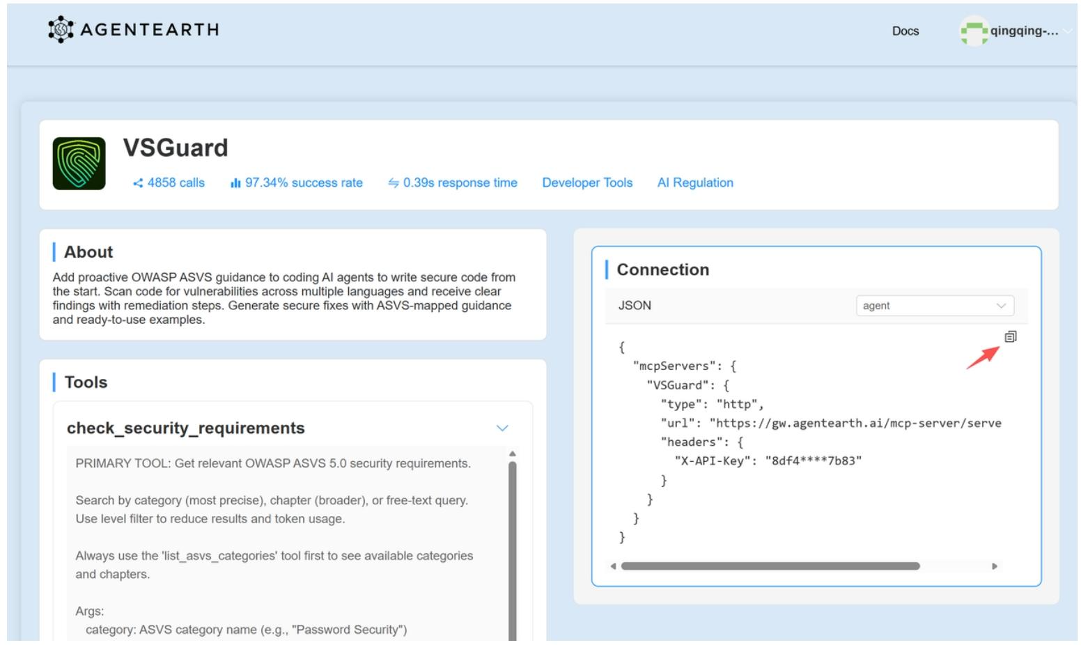 选择目标 MCP 服务(如 VSGuard),复制其对应的配置 JSON 代码,示例如下: