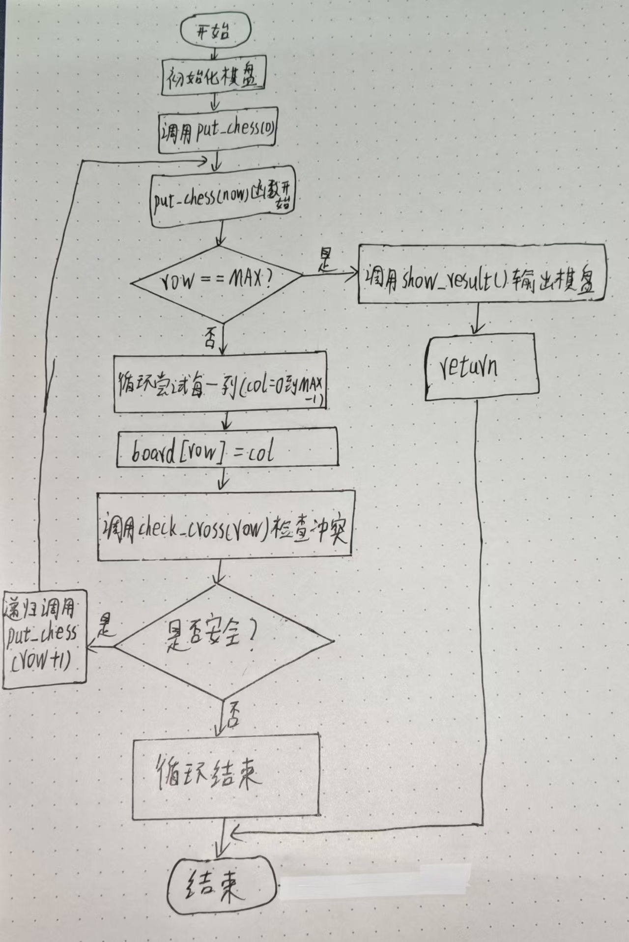递归放置:如果当前位置安全,则递归调用自身,继续放置下一行的皇后。