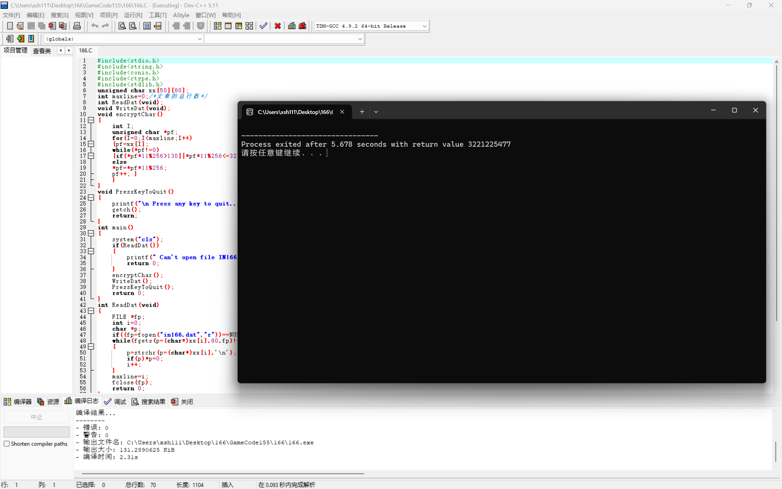 本次课程任务选取编号为166的C语言代码文件,该文件代码核心围绕文件字符的读取、加密与写入展开,属于典型的文件操作与字符处理类程序,能较好地练习C语言文件IO、指针操作及兼容性问题修复,适合作为复古代码修复的实践案例。