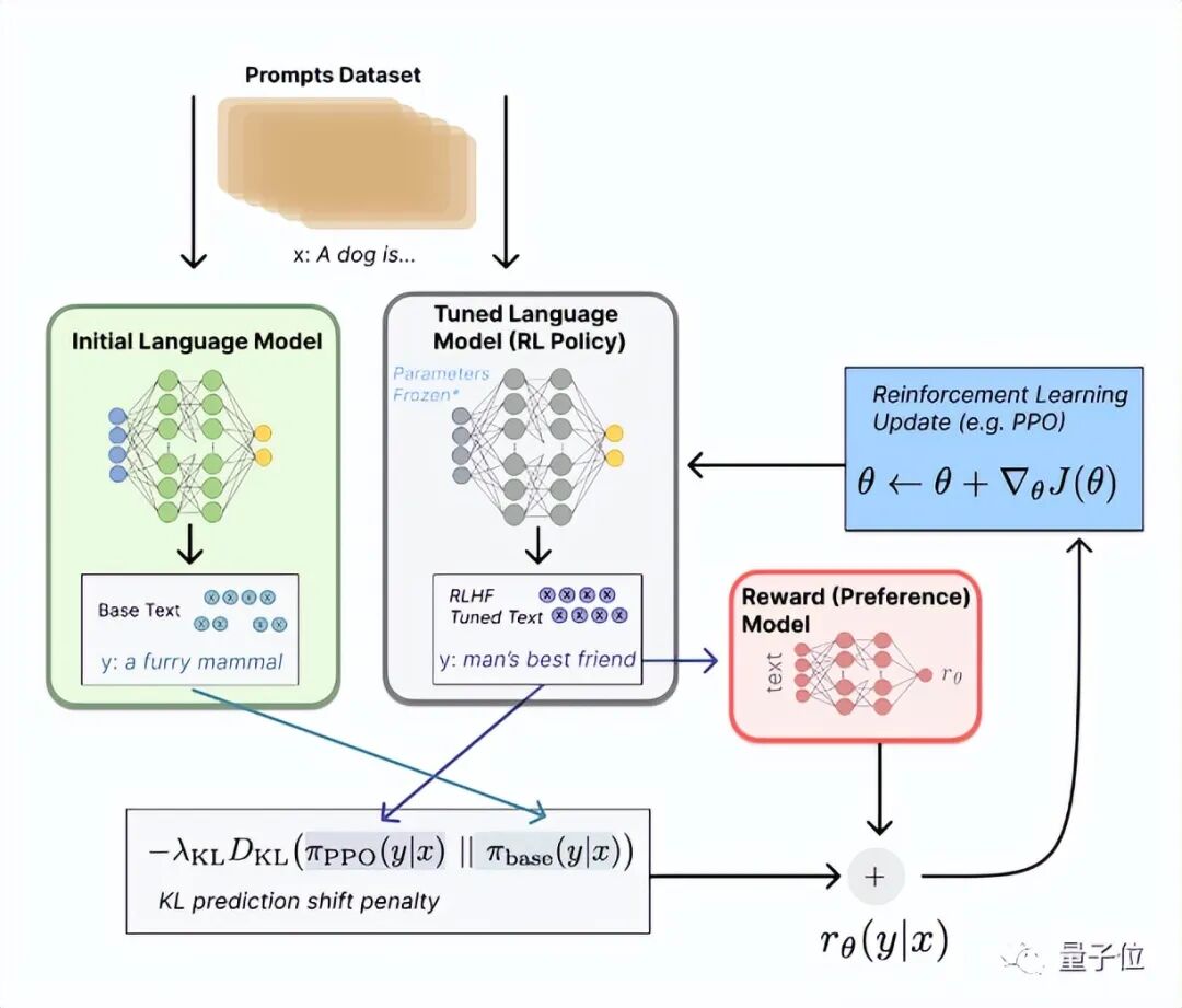 4、强化学习微调:使用训练好的奖励模型作为环境,对预训练模型进行强化学习微调。在这个过程中,预训练模型作为智能体,根据当前的输入状态选择一个输出动作(即生成文本),奖励模型根据生成的输出给出一个奖励分数。预训练模型通过不断地与奖励模型进行交互,学习如何调整自己的策略,以最大化累积奖励,从而生成更符合人类偏好的输出。这个过程类似于一个游戏,智能体通过不断尝试不同的策略,以获得更高的分数。