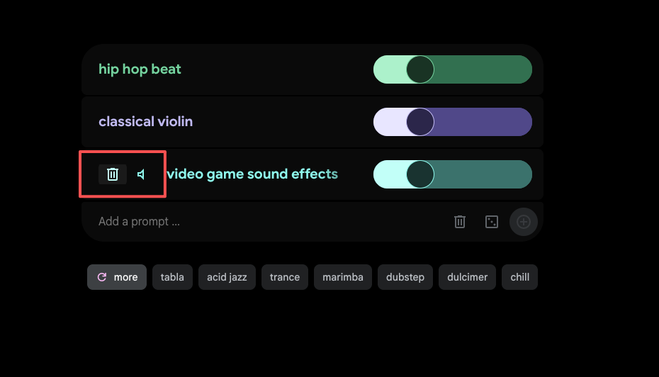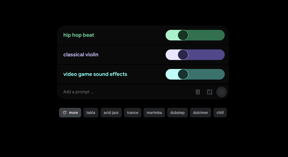 MusicFX DJ 的核心驱动力来自提示词(Prompt)。在界面中部,可以找到 Add a prompt ... 输入区域,此处支持两种添加方式: