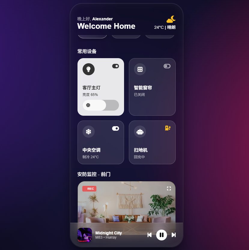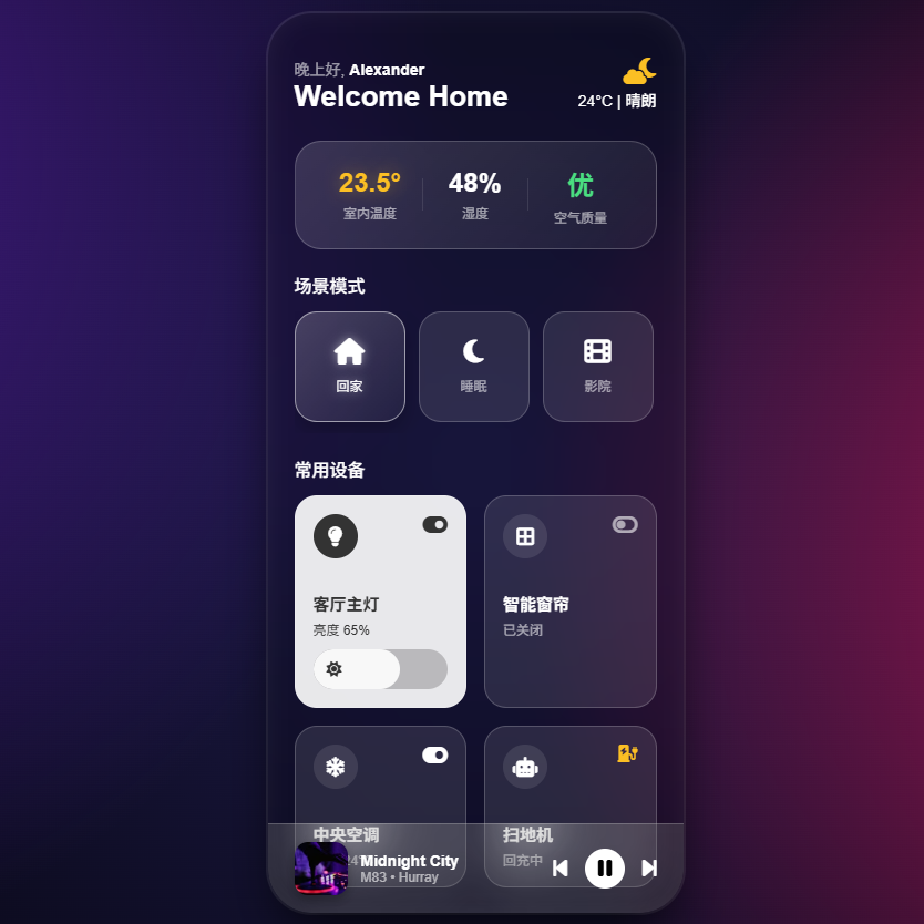 当下最火的 UI 风格。适合树莓派中控屏、智能家居控制中心。