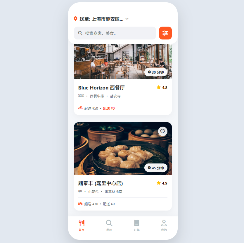 复杂卡片布局:展示了如何在列表项中处理复杂的层级关系。注意看餐厅卡片,图片上方悬浮着“免配送费”标签和收藏按钮(使用了