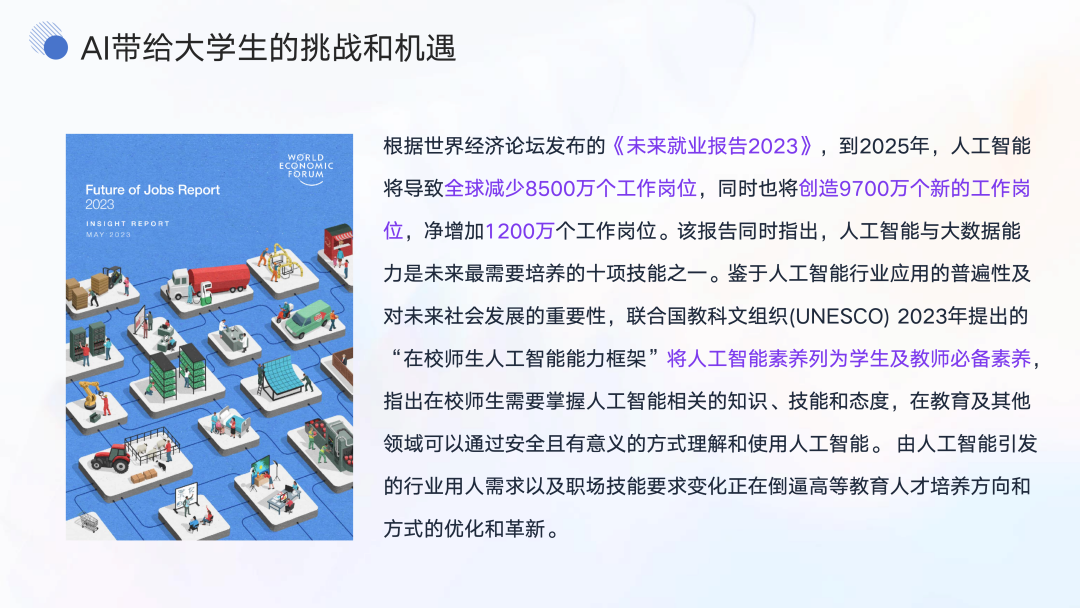 根据世界经济论坛发布的《未来就业报告2023》,到2025年,人工智能将导致全球减少8500万个工作岗位,同时也将创造9700万个新的工作岗位,净增加1200万个工作岗位。该报告同时指出,人工智能与大数据能力是未来最需要培养的十项技能之一。